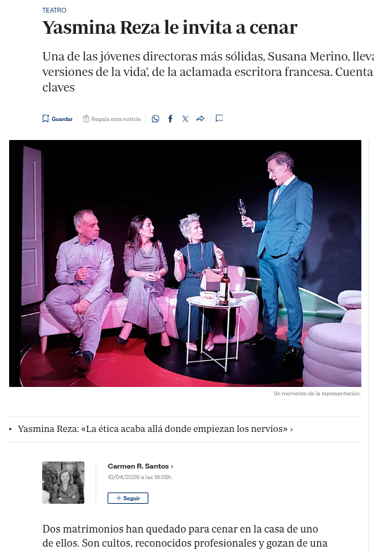 Entrevista a Susana Merino sobre el montaje y dirección de la obra Tres versiones de la vida en el diario ABC, en la sección de Cultura, el pasado día 10 de abril por parte de Carmen R. Santos.